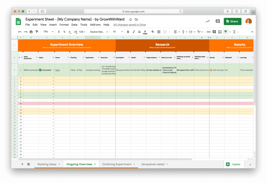 The Growth Experiment Sheet™️ is a Google Spreadsheet to keep track of your growth hacking experiments. I personally use this for all of my coaching & consulting clients. This helps growth teams by giving one source of truth to all team members and stakeholders on where to share new ideas, what growth experiment are prioritized next, and what the status is of each experiment.
